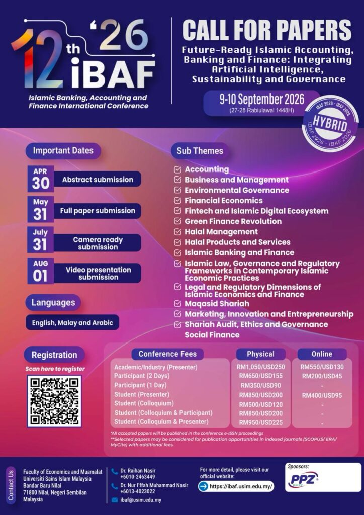 IBAF2026 is an international academic platform where researchers worldwide can share and discuss their research findings in accounting, banking, finance, business, and economy. We welcome conceptual, empirical, papers, and case studies in English, Arabic and Malay languages. Our conference theme includes but are not limited to the following sub-themes: